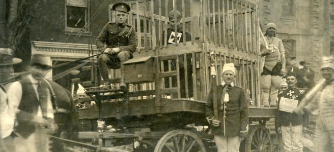 The Prince, presumably Kaiser Wilhelm’s oldest son Friedrich Wilhelm Victor August Ernst, is wearing what appears to be a 19th Century Canadian Militia 7-button tunic with “Austrian Knot” cuffs. The wagon is surrounded by a handful of other characters including one wearing a home-made pickelhaube and holding a sign that says “Von Luddendorff”.
